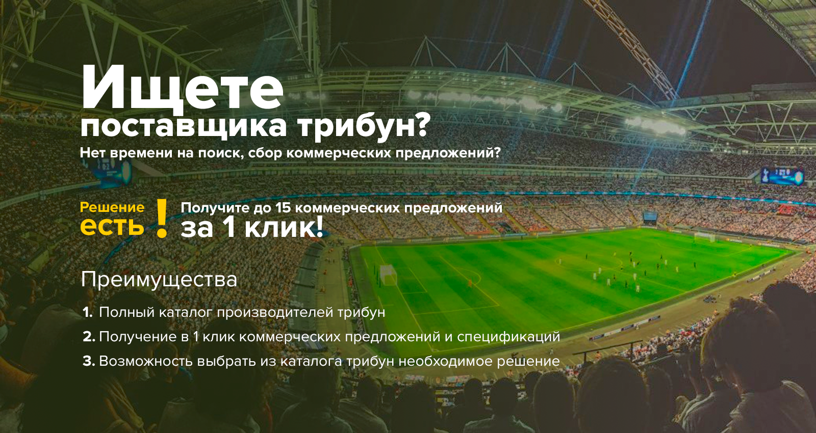 Мы не теряем времени даром, но и не торопимся в ущерб результату. Вы купите трибуны для стадиона по максимально подходящей цене из возможных. Так как мы соберем для вас до 10 коммерческих предложений от разных компаний.